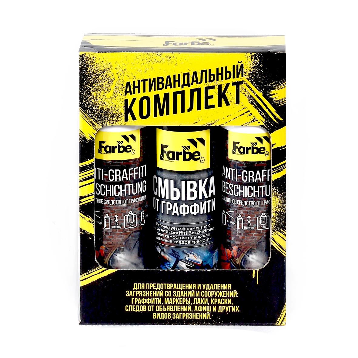 Набор состоит из двух баллонов по 225 мл защитного покрытия FARBE ANTI-GRAFFITI BESCHICHTUNG и одного баллона 225 мл Farbe Смывка от граффити.